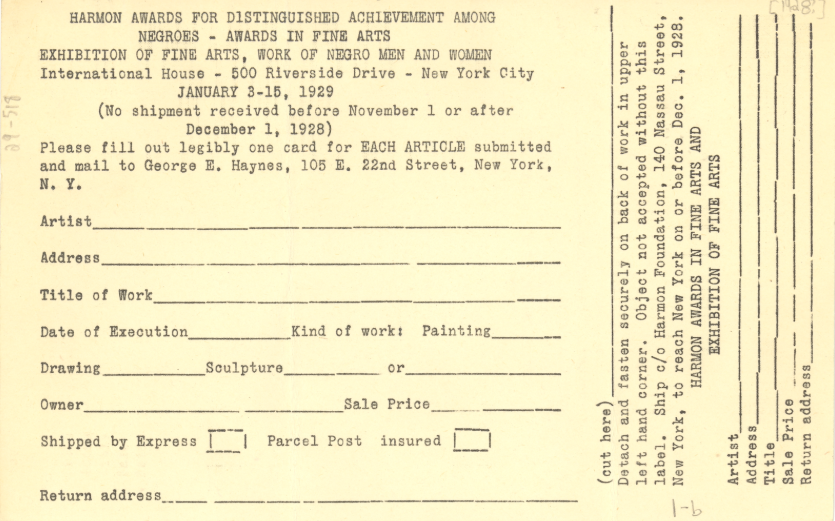 Harmon Foundation Award Submission Card, 1928; Massachusetts Online Collection